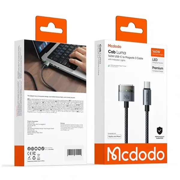 Compatible avec la nouvelle norme PD 3.1, ce câble délivre jusqu’à 140W. Associé à un chargeur Apple (non inclus), il recharge un Mac jusqu’à 60 % en seulement 30 minutes, vous faisant gagner un temps précieux.