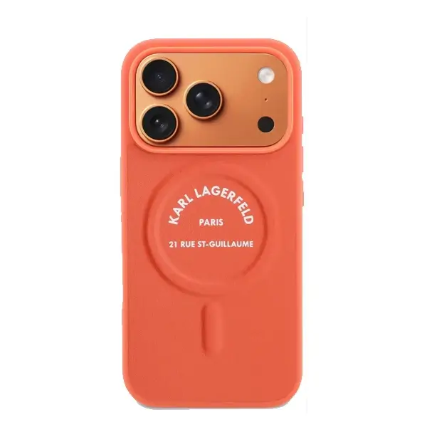 Coque pour iPhone 17 Pro Max – coque de téléphone en PU Karl Lagerfeld – MagSafe – Protection des rayures et autres dommages – Orange – KLOHMP17XPSKRSGEO