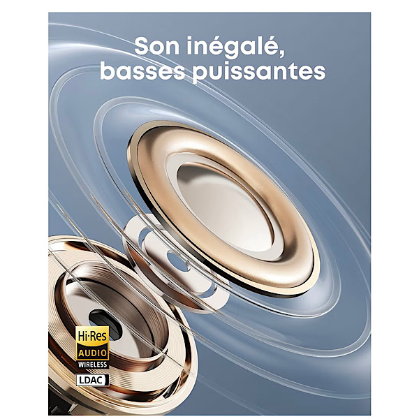 Audio haute résolution, basses riches : profitez d’un son haute résolution et de basses riches avec une qualité sonore impressionnante. Notre technologie avancée de basse virtuelle enrichit les graves, complétée par un pilote recouvert de titane de 12 mm pour une écoute claire. Remarque : mettez à jour l’application Soundcore vers la dernière version pour une expérience d’écoute optimale.