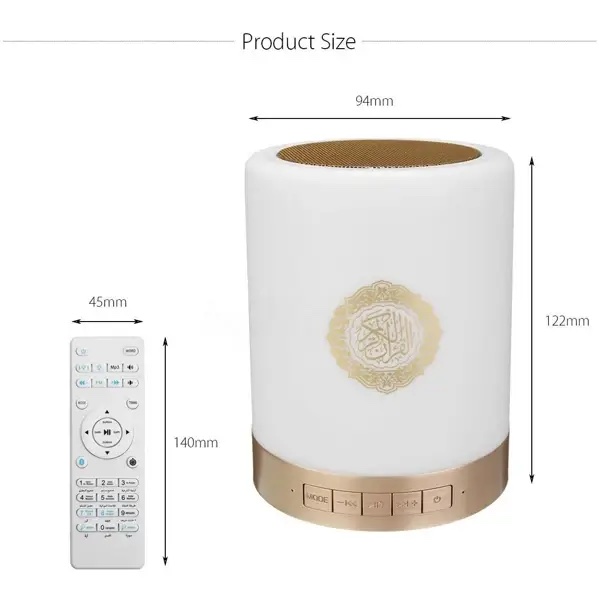 Comme d’autres veilleuses vous pouvez changer facilement la couleur et l’ambiance de la veilleuse en touchant le dessus. Le speaker (Haut-parleur) offre un son suffisamment puissant et nette pour une utilisateur régulière. La portable Veilleuse Coranique Equantu SQ-112 possède même un mode répétition (3 fois) pour celui qui veut apprendre le Coran par exemple.
