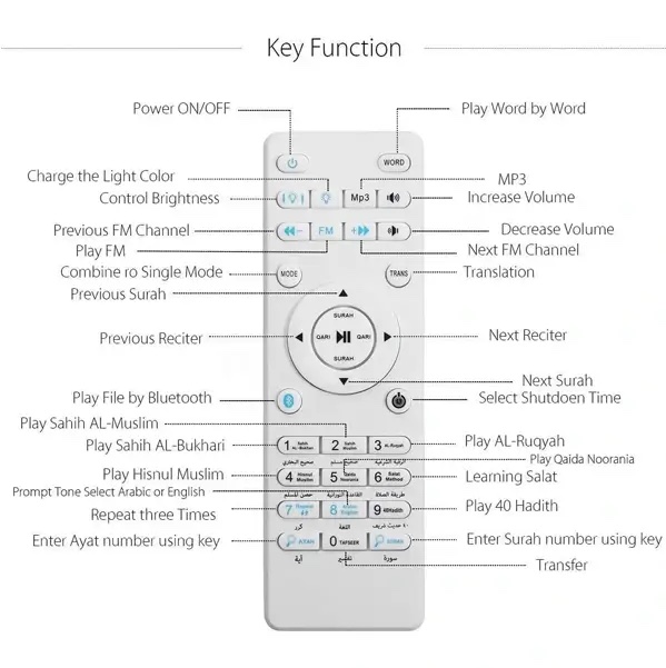 1. Utilisation de la télécommande pour contrôler le haut-parleur du Coran et profiter de l’écoute.